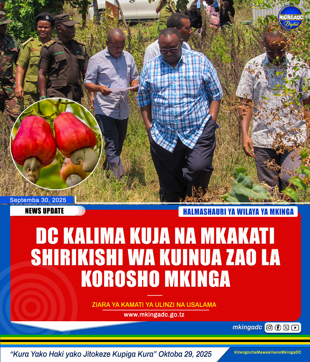 Mkuu wa Wilaya ya Mkinga, Mhe. Gilbert Sylvester Kalima, amesema serikali wilayani humo imejipanga kuanzisha mkakati shirikishi wa kuinua zao la korosho kwa kushirikiana na wananchi, viongozi wa vijiji na wataalamu wa kilimo, ili kuongeza uzalishaji na tija kwa wakulima.